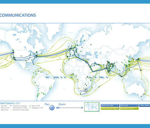 A highly detailed interactive map app for Tata Communications, depicts their global footprint and beautifully simplifies complicated submarine cable network and service footprints…